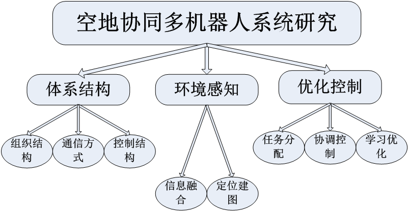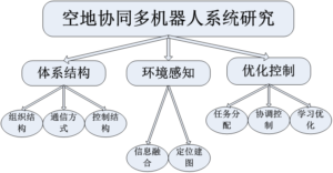 空地协同组成的多机器人系统,个体成员之间往往存在设计、结构、乃至智能上的差异,不同的配置方案可能会影响到不同的研究体系,系统的规模越大对多机器人之间的协同与通信要求更高。空地协同首先地面机器人与无人机之间的通信时必不可少的,合理的通信方式能够很好的解决多机器人之间的信息同步问题。在实现空地协同中,每个机器人的姿态信息和对整个环境的感知的情况也直接影响整个系统的运行,单个个体对于环境的感知的多信息融合然后是整个系统的多信息融合。